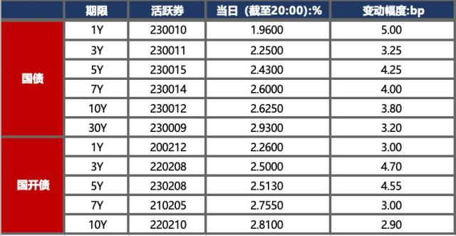 9月1日,房地产利好政策出台压制债市情绪,现券期货明显走弱,银行间主要利率债收益率普遍上行。截至北京时间20:00,10年期国债活跃券230012收益率上行3.80至2.625%;10年期国开债活跃券220210收益率上行2.90bps至2.810%。