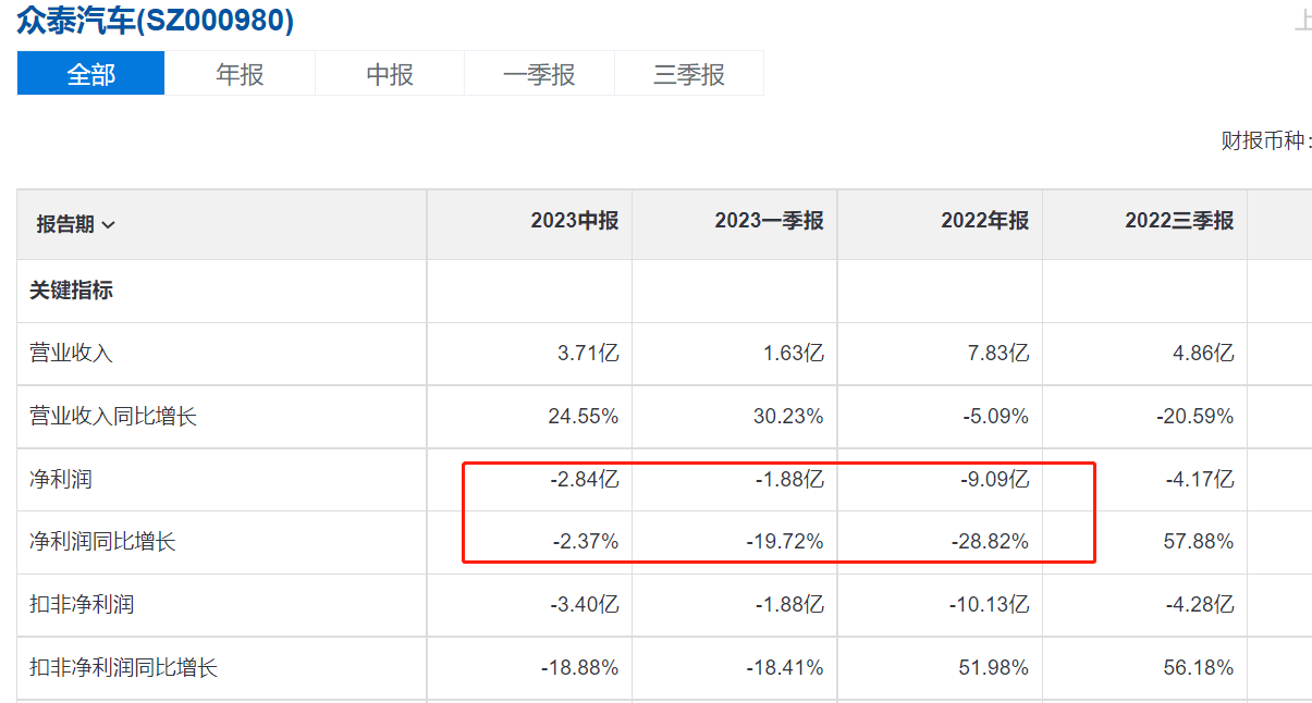 再加上,2023年中报,众泰汽车再亏2.84亿元,其在4年半时间里,共亏损了234亿元左右。