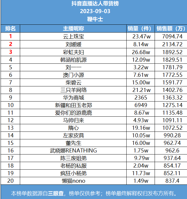 9月3日,抖音直播达人带货榜一是云上珠宝,销售额7094.74万;榜二刘媛媛,销售额2134.72万;榜三彩虹夫妇,销售额1892.52万。