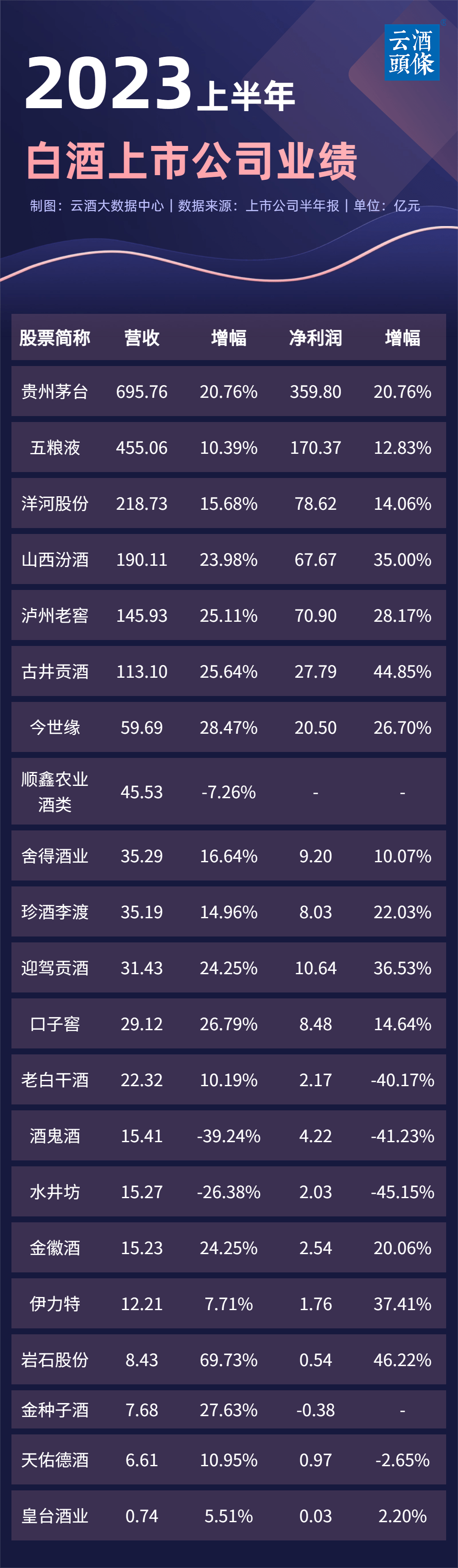 今年上半年,以贵州茅台、五粮液、洋河股份、山西汾酒、泸州老窖、古井贡酒所组成的行业前六格局依然稳固,营收、净利润都来到高点,且均实现双位数增长,领先于腰部企业。
