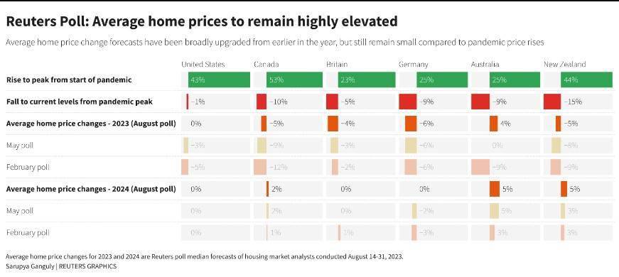 今年早些时候,分析师曾预测,由于抵押贷款利率上升,房价将出现两位数的下跌。但因为家庭储蓄增加、供应紧张和移民人数增加限制了房价下跌,这种预测并没有完全实现。