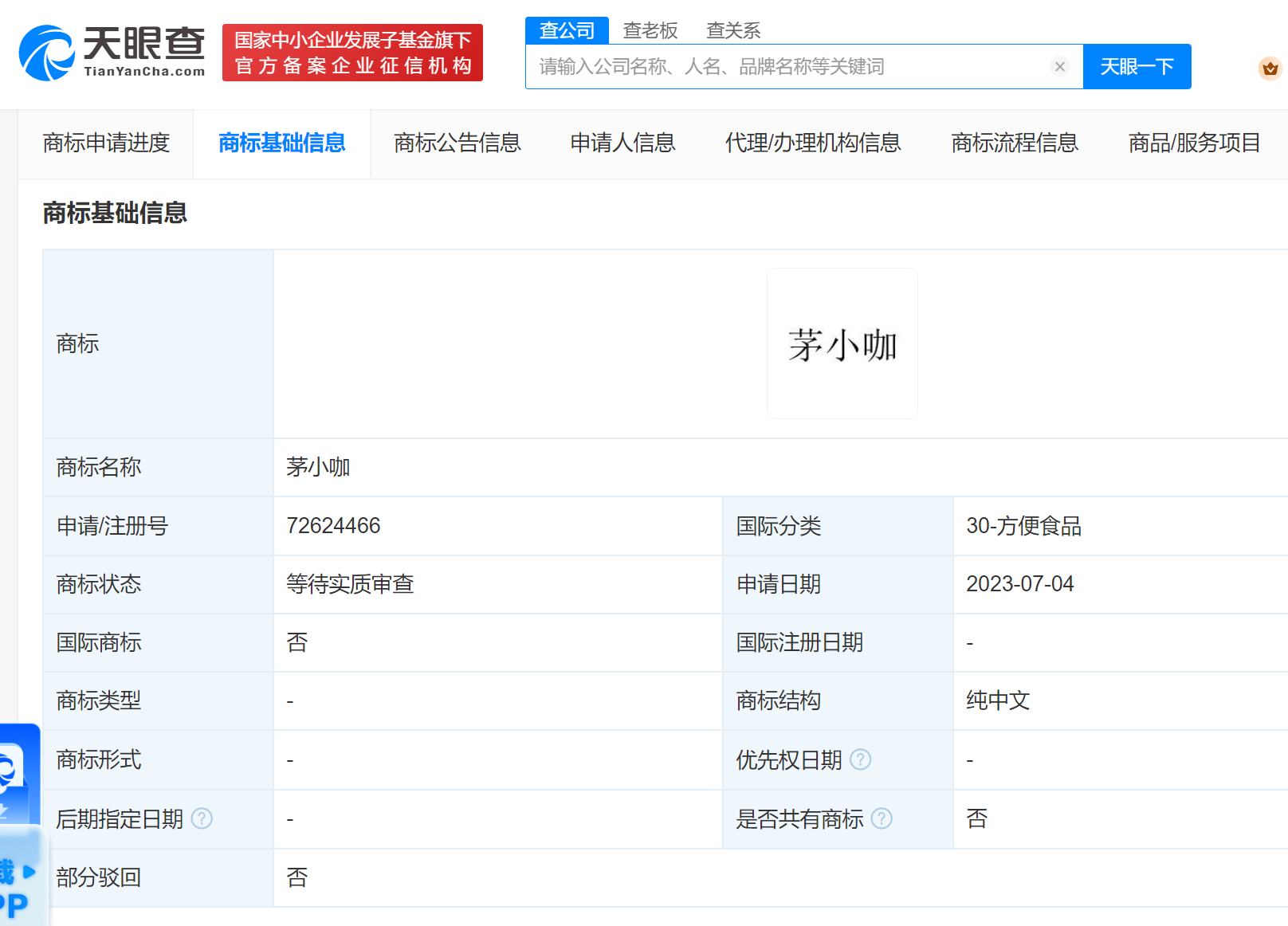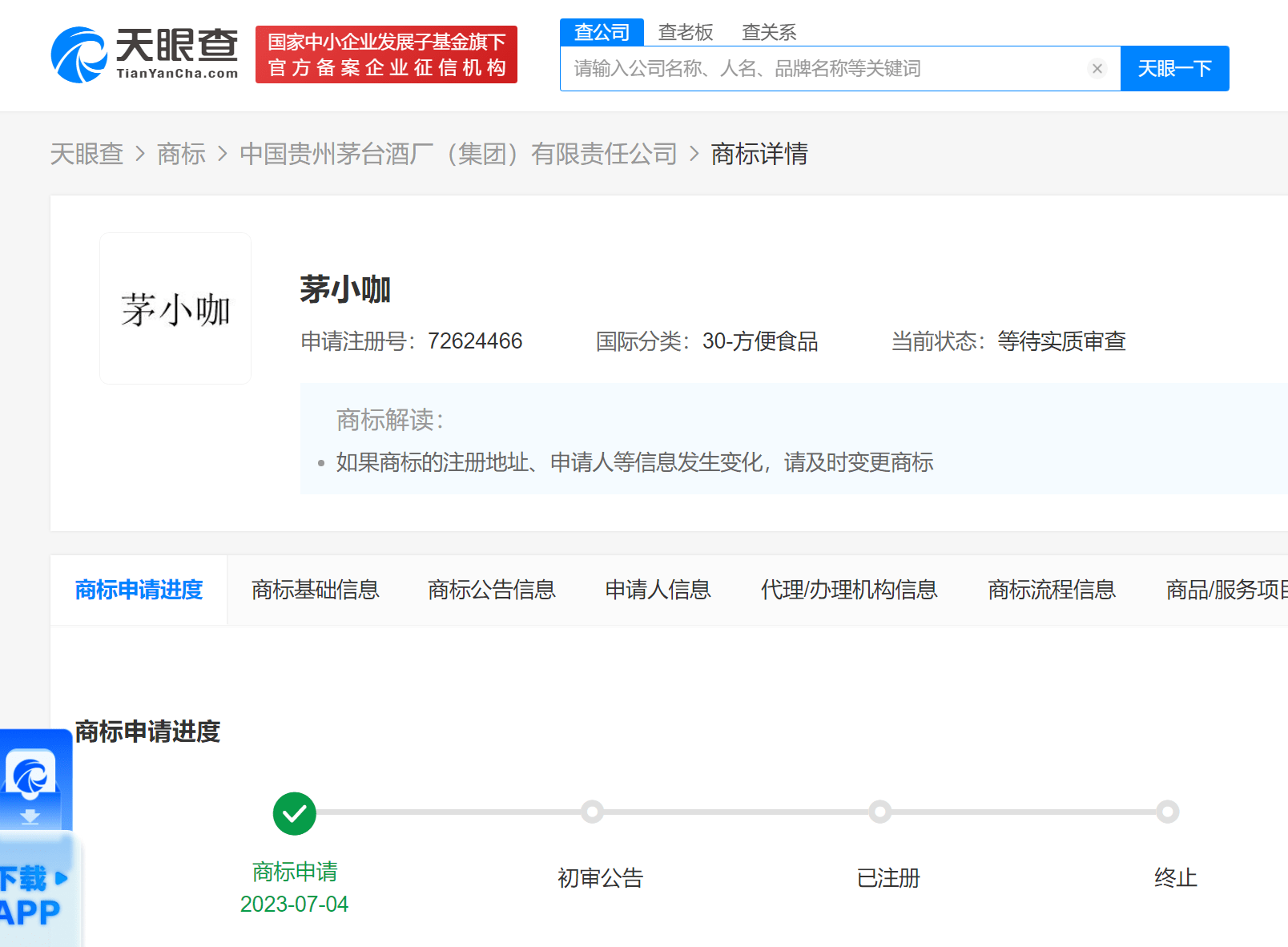 天眼查App显示,今年7月,中国贵州茅台酒厂(集团)有限责任公司申请注册一枚“茅小咖”商标,国际分类为方便食品,当前商标状态为等待实质审查。