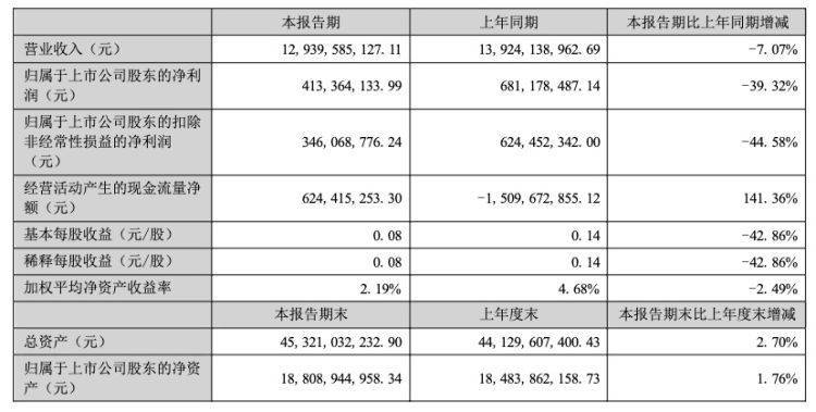 格林美2023年半年报披露,报告期公司营业收入129.396亿元,同比下降7.07%;归属于上市公司股东的净利润4.13亿元,同比下降39.32%;归属于上市公司股东的扣除非经常性损益的净利润3.46亿元,同比下降44.58%;基本每股收益0.08元。