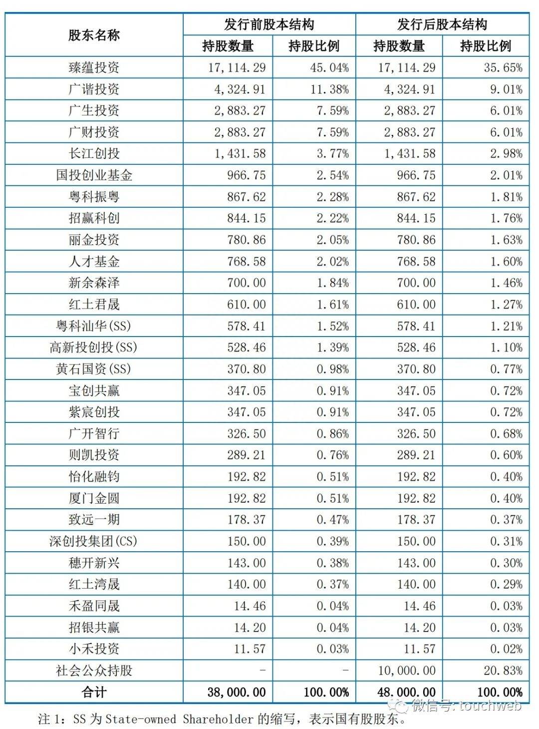 IPO后,臻蕴投资持股为35.65%,广谐投资持股为9.01%,广生投资、广财投资分别持股6.01%,长江创投持股为2.98%,国投创业基金持股为2.01%,粤科振粤持股为1.81%,招赢科创持股为2.76%,丽金投资持股为1.63%,人才基金持股为1.6%,新余森泽持股为1.46%,红土君晟持股为1.27%。