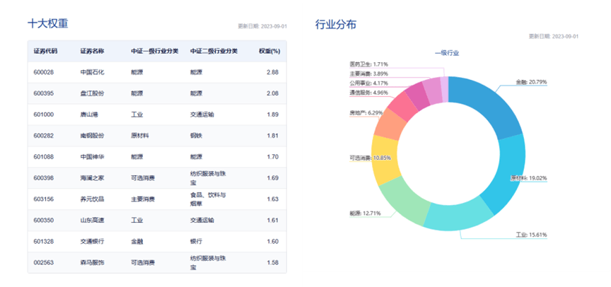 红利策略的特征天然以偏价值行业标的为主,从数据来看,截至2023年9月1日,该指数的重仓行业有金融、原材料、工业、能源、可选消费、房地产等;前十大权重股包括中国石化、盘江股份、唐山港、南钢股份、中国神华等,前十大权重股占比合计约为18.45%;(数据来源:中证指数公司,指数成份股不代表个股推荐)