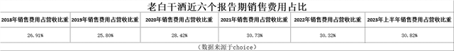2018年、2019年、2020年、2021年、2022年、2023年上半年,老白干酒的销售费用占比分别为26.91%、25.8%、28.42%、30.73%、30.32%、30.82%,销售费用占比为上升状态。