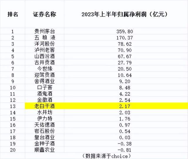 与之相反,其余13家酒企的归属净利润数值低于20亿元,其中有6家酒企归属净利润数值低于2亿元,处于亏损情形的是金种子酒和顺鑫农业,老白干酒的归属净利润规模排第13名。