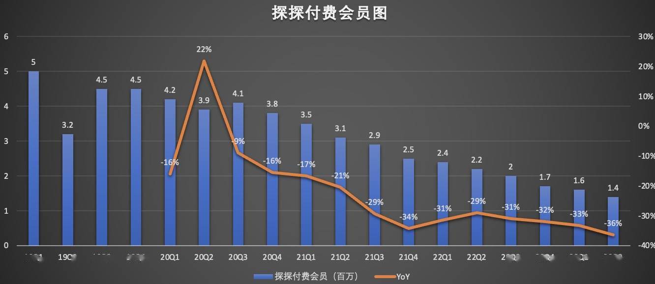 今年二季度,探探的月活用户为1730万,相比去年同期的2480万,净流失750万,与一季度的1950万相比,净流失220万。探探的付费会员为140万,与去年同期的220万相比,净流失80万,与一季度的160万相比,净流失20万。