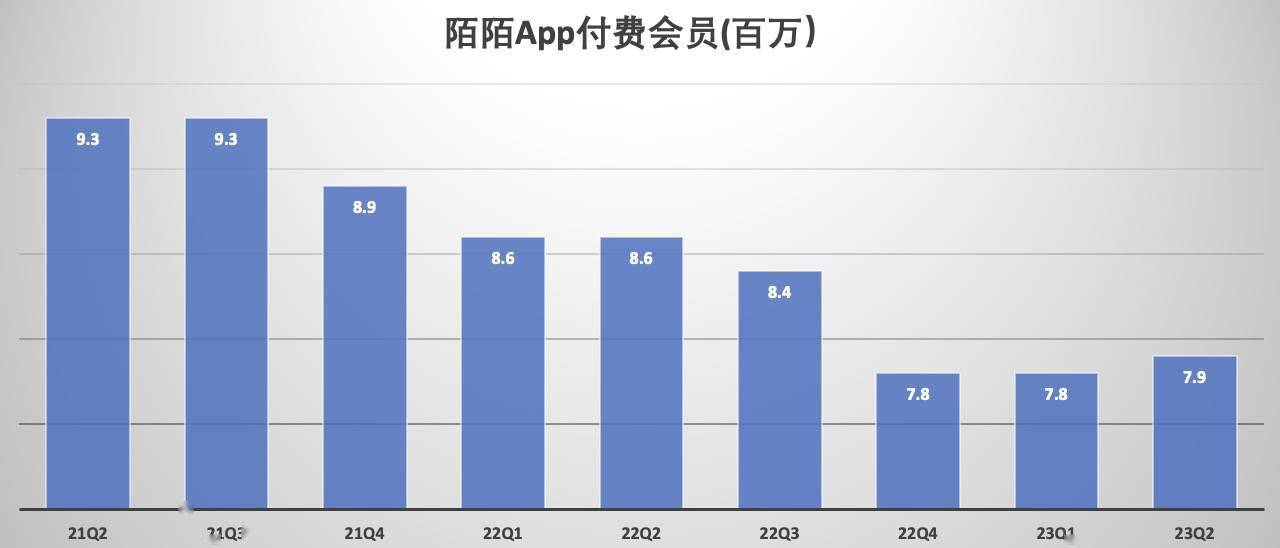 需要提醒注意的是,挚文集团此次并未在财报中披露陌陌App的月活跃用户数据,根据今年一季度财报披露的数据,截止2023年第一季度,陌陌App月活用户为1.065亿,与去年同期的1.109亿相比,净流失440万。今年二季度,陌陌App的付费用户为790万,与去年同期的860万相比,净流失70万,好在相比一季度的780万,陌陌App付费用户环比增长10万。