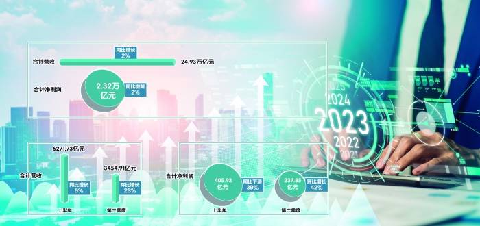 上半年,沪市主板公司合计实现营业收入24.93万亿元,同比增长2%;净利润2.32万亿元、扣非后净利润2.23万亿元,同比分别微降2%、1%。与2019年同期相比,上述3项指标分别增长31%、16%和21%,年均复合增长率7%、4%和5%。其中,实体公司上半年实现营业收入20.32万亿元,同比增长2%;净利润1.08万亿元、扣非后净利润0.99万亿元,同比均下滑7%。分季度看,走出先降后升曲线,较之一季度,二季度的3项指标环比分别增长9%、5%和6%。更为可喜的是,企业经营“造血”能力明显恢复,实体公司上半年实现经营性现金净流入1.28万亿元,同比增长22%。