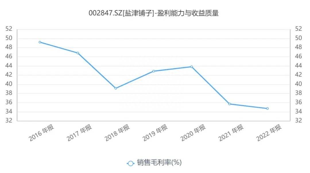 由于经销渠道占比逐年上升,盐津铺子的毛利率也受到一定的影响。2020年—2022年,公司的毛利率分别为43.83%、35.71%、34.72%。