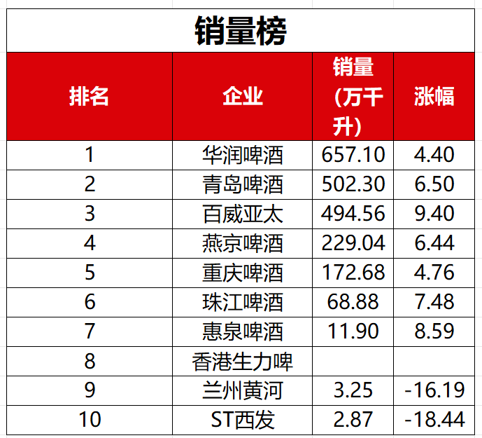 其中,华润啤酒、青岛啤酒分别以657.10万千升、502.30万千升的销量排在上市啤酒企业的前两位,百威亚太则以494.56万千升降至第三位。