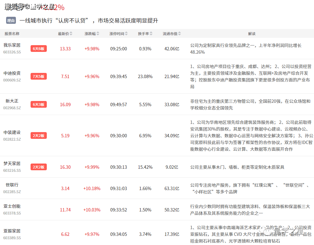 房地产板块今日集体大涨,我乐家居6连板,中迪投资、新大正等多股涨停。