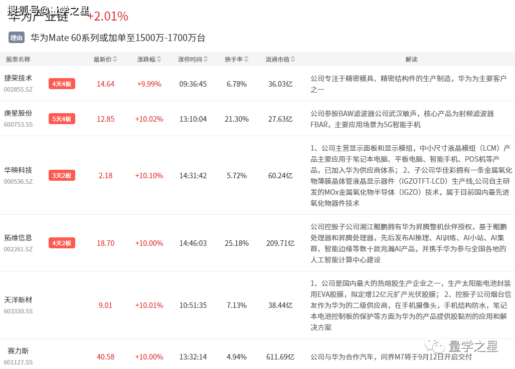 华为产业链今日大涨,捷荣技术4连板,庚星股份、华力创通等多股涨停。