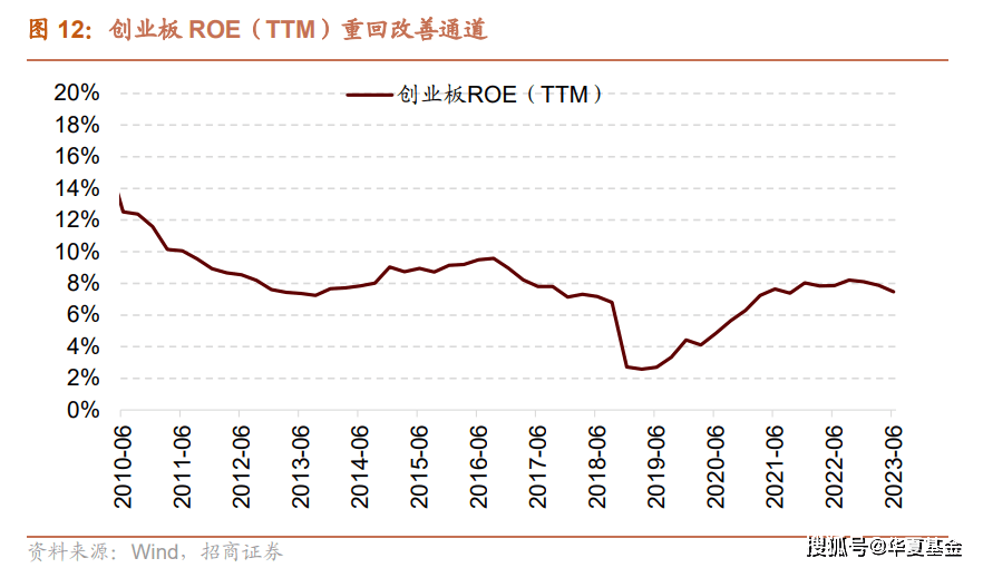 同时,根据中报数据显示,创业板指主营业务收入增速也在快速反弹。本轮创业板盈利能力修复是从2019Q2开启,与医药、新能源、消费电子等相关度高的公司2021Q2以来盈利持续改善,目前ROE(TTM)修复至 7.5%的较高水平。