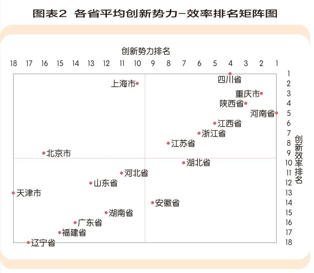 基于各省平均创新势力与平均创新效率的排名,我们将18个省份和直辖市划分为四个象限(图表2)。