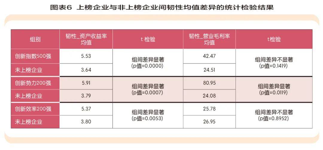 在5%的显著性水平下,创新指数500强企业、创新势力200强企业、创新效率200强企业的韧性_资产收益率均高于未上榜企业,报告认为2022年样本中那些创新规模较大或创新效率较高的企业在过去的四年间拥有更稳定的资产收益率。其次,围绕韧性—营业毛利率这一指标的统计检验结果显示,创新势力200强企业的韧性在5%的显著性水平下高于非创新势力200强企业,创新指数500强企业、创新效率200强企业的韧性相较于未上榜企业而言不存在显著差异,《报告》认为2022年样本中创新规模较大的企业在过去四年间拥有更稳定的营业毛利率。