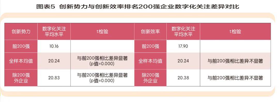 另外,同样在t检验下,创新势力200强企业数字化关注平均水平为10.16,200强企业之间对数字化关注平均水平差异不大,总样本平均水平为20.24,创新势力200强外的企业数字化关注平均水平为20.83,与创新势力200强企业数字化关注平均水平差异显著,不同的是,创新效率200强企业在数字化关注平均水平t检验中,与总样本对比、200强外企业对比均不存在差异显著(如图表5)。