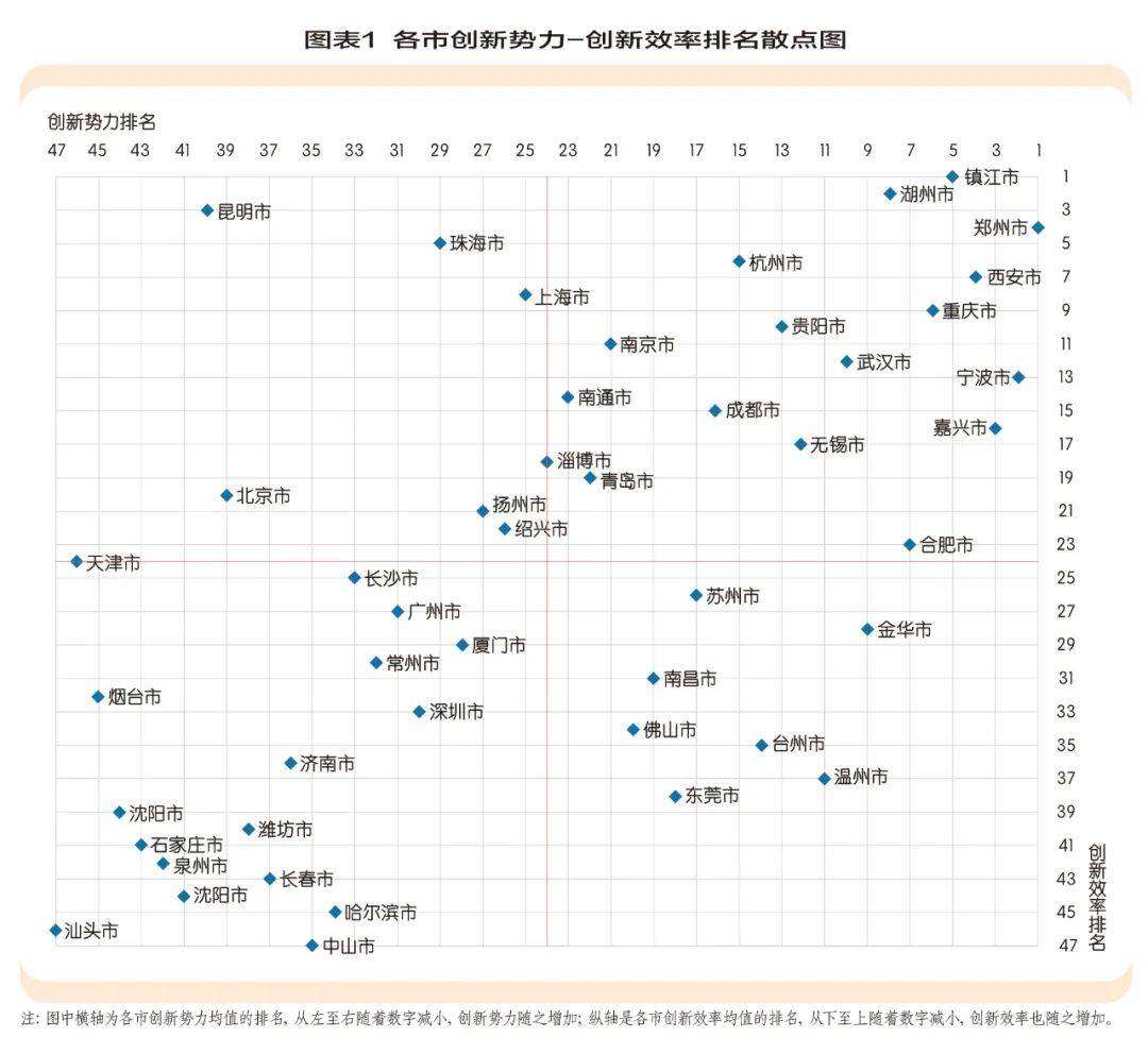 比较两大关键指标中,也能够发现,创新势力排名较高的城市未必是创新效率较高的城市。如图表1所示,将47个城市按照创新势力和创新效率的均值排名划分为四象限后,第一象限为高势力-高效率城市,以镇江、郑州、西安为首,创新势力、创新效率整体表现较好;第二象限是低势力-高效率城市,包括上海、北京、珠海、昆明等城市,这些城市创新效率方面具有较大优势,创新势力有待提高;第三象限为低势力-低效率城市,这些城市在两项指标上表现均不突出;第四象限为高势力—低效率城市,这些城市在创新势力方面具有较大优势,但其创新效率有待提升。