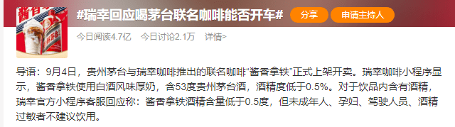 “喝完瑞茅联名能否开车”的话题近5亿阅读量登顶微博热搜,成为今年以来热度最大的爆款饮品,这也是瑞幸有史以来热度最高的饮品。