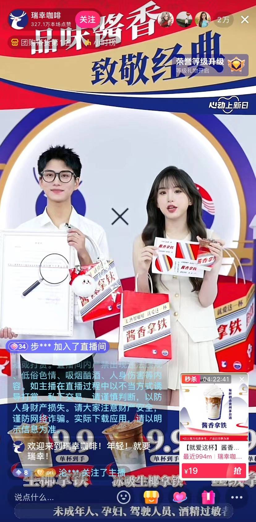 9月4日,瑞幸与茅台联名饮品上市引发消费热潮,部分门店点单系统一度卡崩,无数网友涌入瑞幸抖音直播间。
