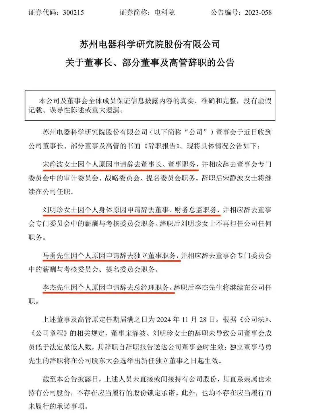 9月1日晚,苏州电器科学研究院股份有限公司发布公告称,近日收到董事长宋静波、部分董事及高管的书面《辞职报告》。