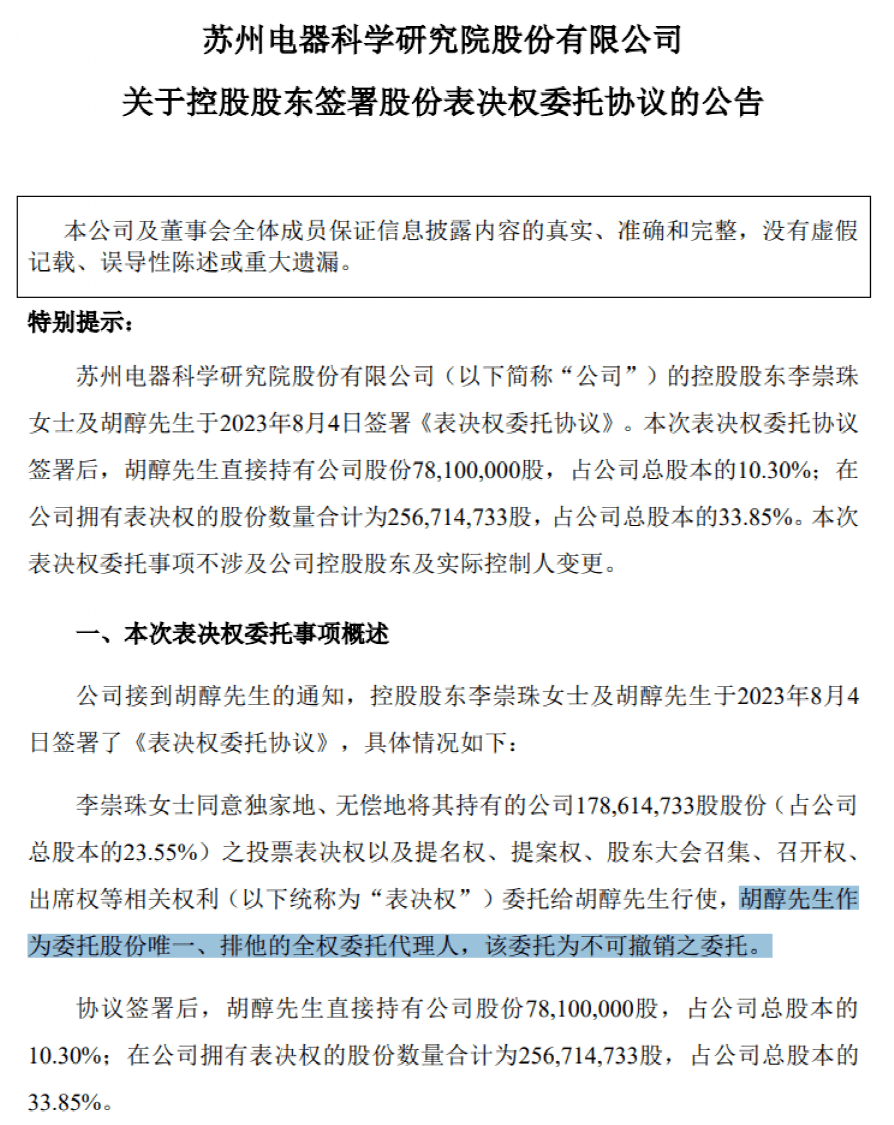 8月7日,电科院公告,李崇珠同意独家地、无偿地将其持有的公司23.55%股份的投票表决权以及提名权、提案权、股东大会召集、召开权、出席权等相关权利(以下统称为“表决权”)委托给胡醇行使,胡醇作为委托股份唯一、排他的全权委托代理人,该委托为不可撤销之委托。由此,胡醇在公司拥有表决权的股份占公司总股本的33.85%。