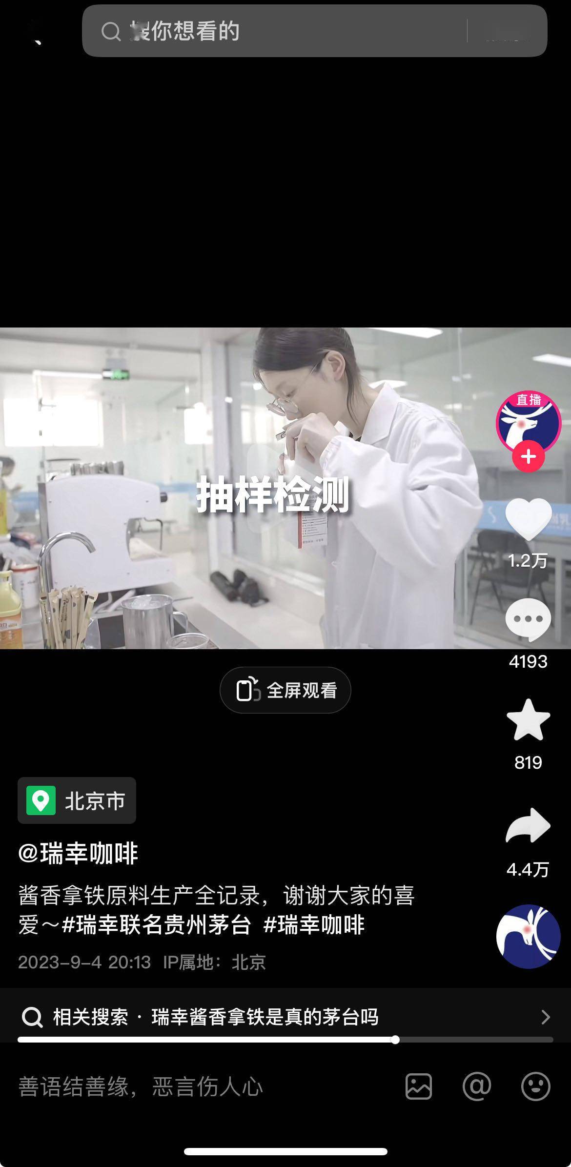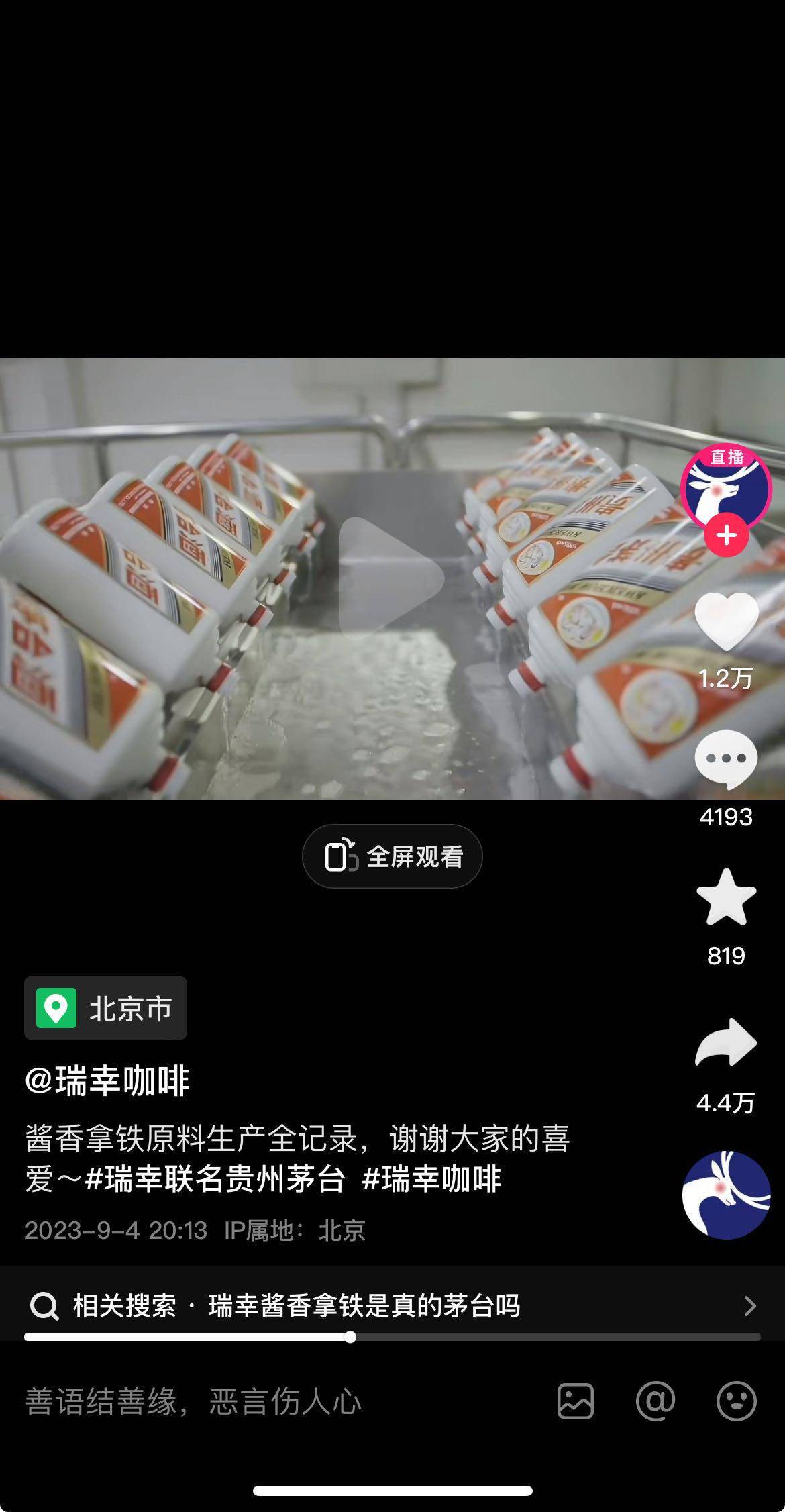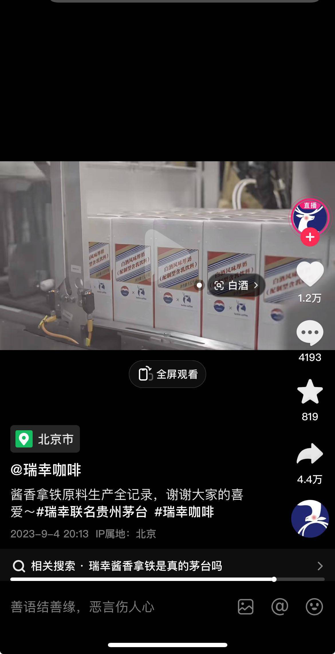 瑞幸公布的视频显示,成车的茅台酒被运到原材料生产工厂,茅台酒开封后被放到生产线用于生产原材料“厚奶”。为了达到标准,产品还进行了严格的检测后才大货批量生产。
