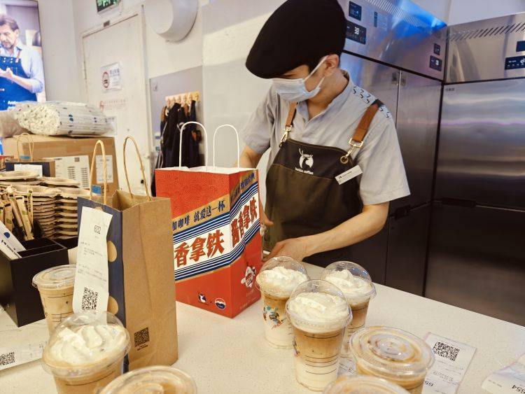 9月4日中午12点,记者在福田瑞幸咖啡金色家园店看到,店内热闹异常。柜台里,3名工作人员正忙碌地制作饮品,柜台外,十几名消费者以及外卖骑手正在排队等待。台面上,成排摆放着的“酱香拿铁”等待着被店员装进红色手提袋。这个印有“美酒加咖啡,就爱这一杯”文字的纸袋,成为当天朋友圈刷屏的“利器”。