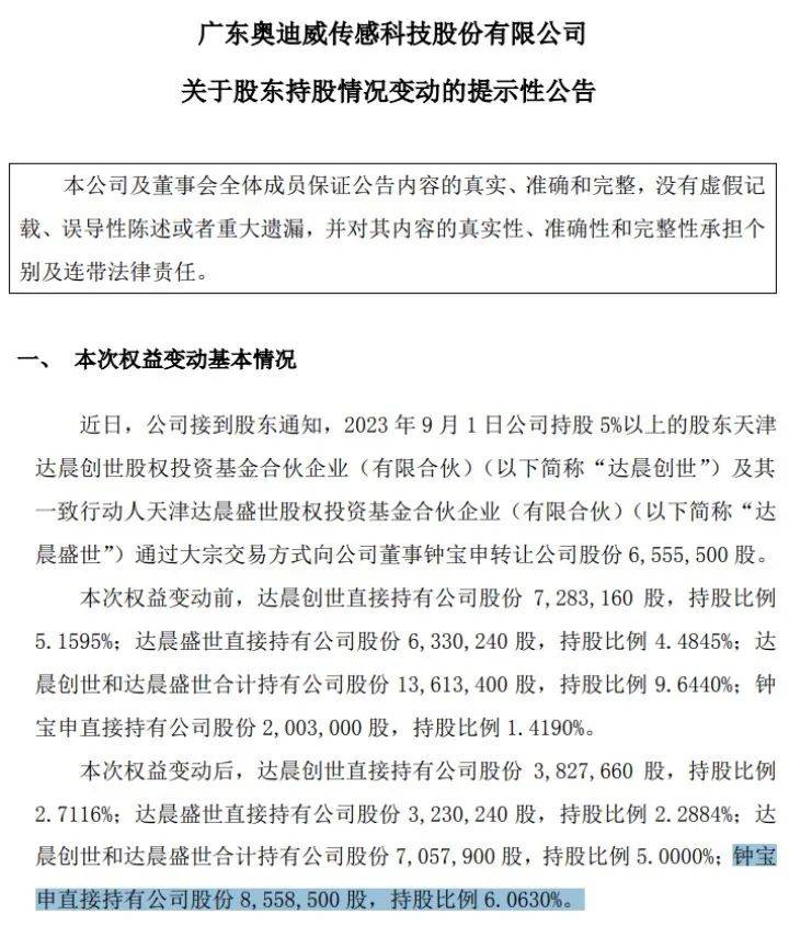9月4日晚间,北交所上市公司奥迪威公告称,近日,公司接到股东通知,2023年9月1日,公司持股5%以上的股东天津达晨创世股权投资基金合伙企业(以下简称“达晨创世”)及其一致行动人天津达晨盛世股权投资基金合伙企业(以下简称“达晨盛世”),通过大宗交易方式向公司董事钟宝申转让公司股份655.55万股。