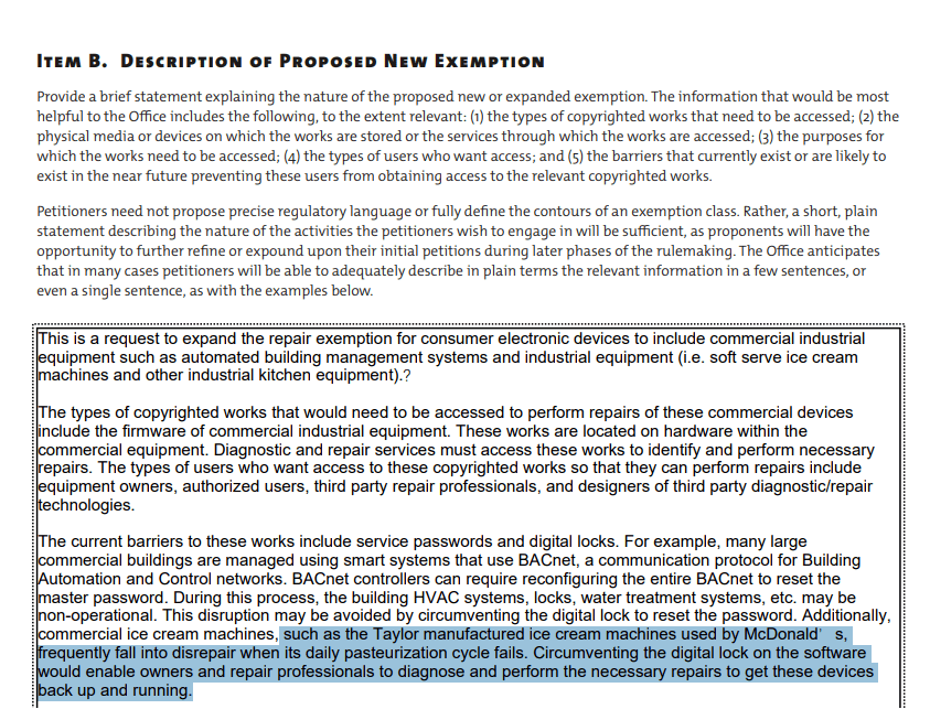 前两天主张数码产品维修权的网站 iFixit ,联合 Public Knowledge ,提交了一份请愿书,要求美国版权局允许人们自主修理商业设备,其中就包括了麦当劳的冰淇淋机。