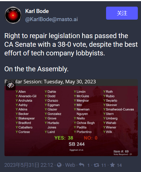 今年5 月底的时候,加州州参议院全票通过了电子产品的维修权法案,不久前苹果也表示将会支持这项法案。
