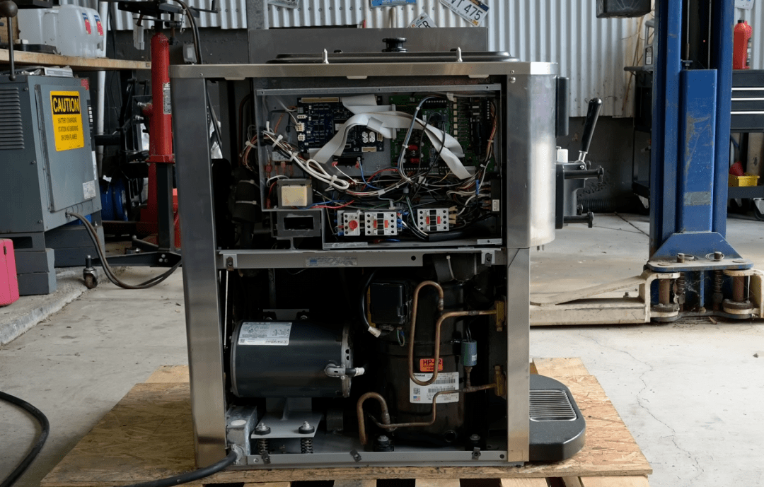 一台冰淇淋机由 压缩机、马达、搅拌机这三个大的主要原件所组成,机器的上半部分是电路控制板,来控制冰淇淋机每个步骤的操作。