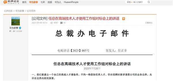 9月4日,华为心声社区发布华为创始人任正非在高端技术人才使用工作组对标会上的讲话文件,谈到了人才与如何留住优秀人才等内容。