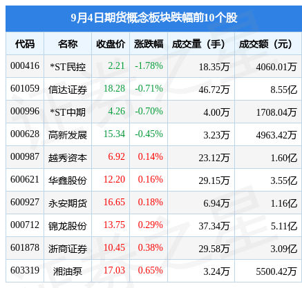 9月4日期货概念板块较上一交易日上涨1.66%,中金岭南领涨。当日上证指数报收于3177.06,上涨1.4%。深证成指报收于10611.74,上涨1.41%。期货概念板块个股涨跌见下表: