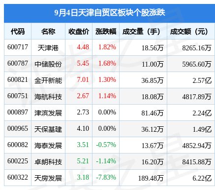 9月4日天津自贸区板块较上一交易日上涨0.22%,天津港领涨。当日上证指数报收于3177.06,上涨1.4%。深证成指报收于10611.74,上涨1.41%。天津自贸区板块个股涨跌见下表: