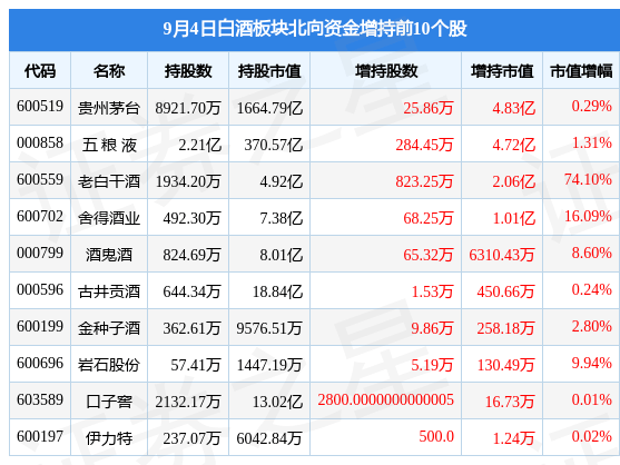 北向资金方面,当日白酒板块北向资金持股市值为2385.26亿元,增持9.01亿元。其中增持最多的是贵州茅台,增持了4.83亿元。减持持最多的是山西汾酒,减持了1.56亿元。白酒板块北向资金持股变动明细见下表: