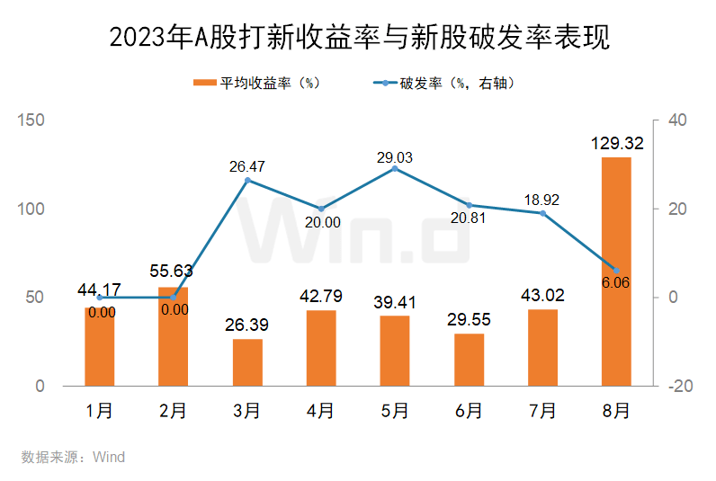从新股上市表现来看,据Wind数据显示,8月份共33只新股上市,按收盘价计算,新股首日平均收益率高达129.32%,创年内月度打新收益率新高。1-7月新股首日平均收益率仅40%左右。