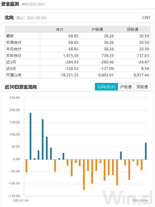 9月4日,北上资金大幅净流入68.85亿元,单日金流入额创一个月以来新高。从近期北上资金变动趋势来看,8月份,北上资金净流出约900亿元,9月首个交易日净买入,本月外资动向值得期待。