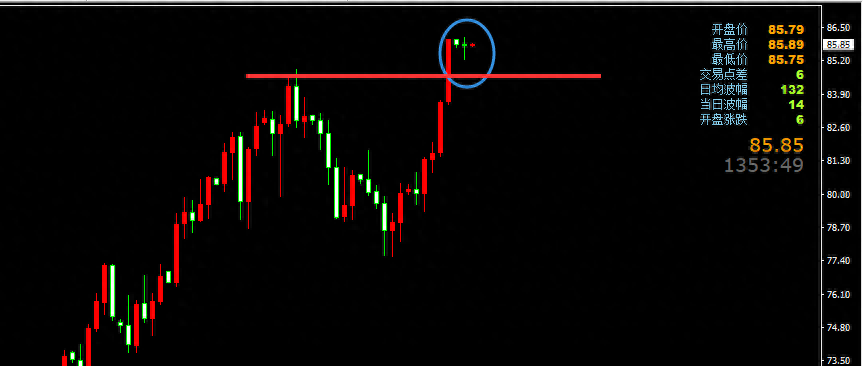 原油首次触及86.3/4空,防守87.2,看85下方,回踩84.4/5多,防守83.6,看86上方