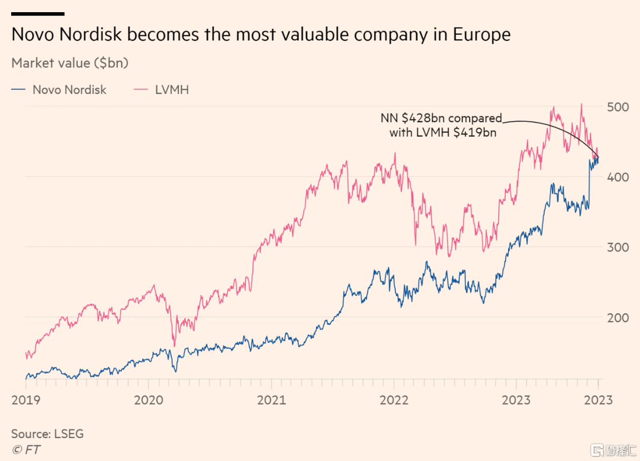 上周五,诺和诺德的美股市值才超越奢侈品巨头LVMH,成为欧洲市值第一高的上市公司。受到此次消息影响,诺和诺德一度涨超2%,最终收涨0.7%,创盘中、收盘历史新高。