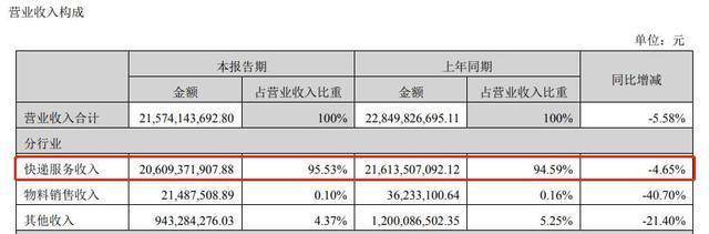 值得注意的是,公司期内营业收入出现5.58%的同比降幅,主要原因是营收占比超95%的快递服务收入同比下滑4.65%,其余物料销售收入等均出现明显下滑。