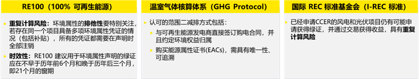 GEC是我国可再生能源电量环境属性的唯一证明。RE100(100%可再生能源)、国际REC标准基金会(I-REC标准)等国际机构均对我国绿证进行过评估和关注,并从重复计算、时效性等方面提出了疑虑和担忧;全球范围应用最广泛的温室气体核算指南《温室气体核算体系》(GHG Protocol)中对范围二的核算方法也提出了建议,要求绿证需具有唯一性、可追溯。