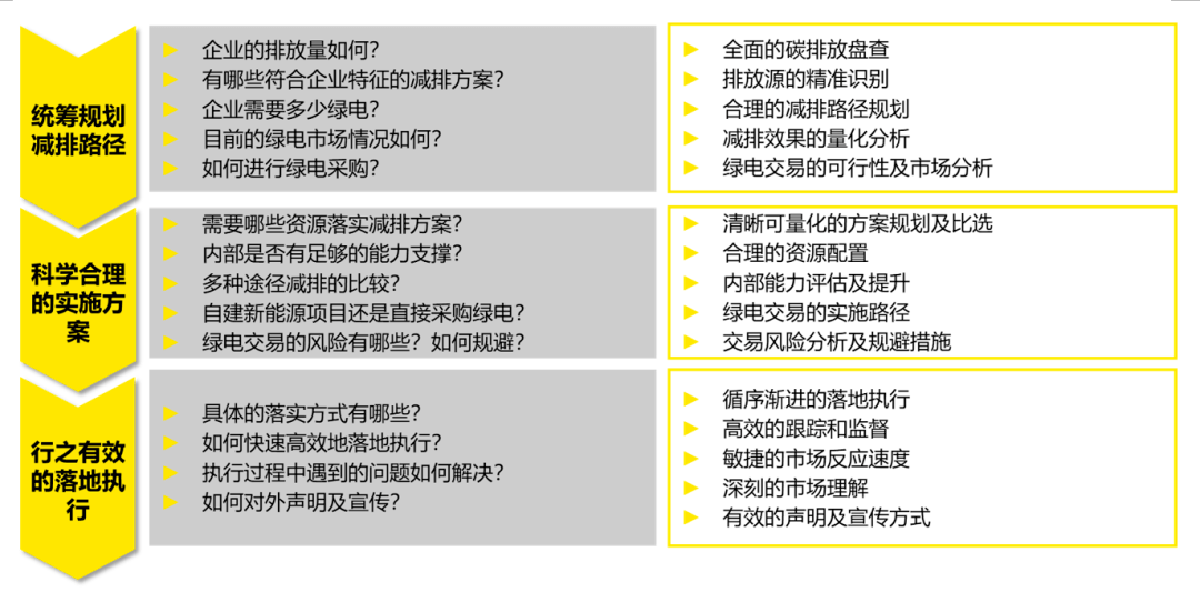 绿电交易是企业降碳减排的重要途径和手段之一。企业需提早谋划、统筹规划,结合企业实际情况进行绿电交易和整体的碳排管理。企业需统筹制定减排路径以规划战略方向,形成科学合理的实施方案以明确实施路径,配合以行之有效的落地执行措施,方能充分发挥绿电交易对企业减排的助力作用,通过成本收益最优的方式实现减排目标。