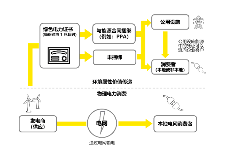 绿证和绿电均能支持企业的绿色能源消费声明,但是“证电合一”的绿电比绿证更有公信力。可再生能源发电企业通过出售绿证获取环境价值收益,绿证的购买方则获得了声明权,即宣称自身使用了绿色能源。绿证交易并不依托于可再生电力的物理传递,是一种“非捆绑式”的交易方式。绿电交易在实现绿证环境属性价值传递的同时,通过将绿证与能源合同的捆绑,实现绿电生产消费的匹配性,将环境价值并轨到电力商品的供给、定价和结算。