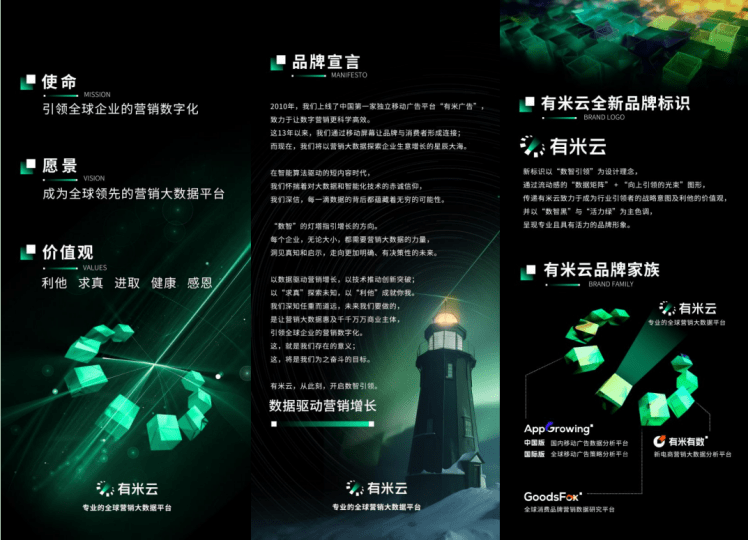 基于这些趋势和成绩,营销大数据已成为公司的战略核心,有米科技公司也迎来了自己的新局面。对此,陈第正式宣布重塑企业品牌战略,原营销大数据业务品牌“有米云”升级为企业品牌,将在未来代替原“有米(Youmi)”品牌统一对外与客户及合作伙伴做生意、打交道。同时有米云还刷新了品牌使命、愿景和价值观,并推出全新品牌形象。有米云将以“数据驱动营销增长”的核心主张,致力于成为营销大数据赛道的领导者品牌,引领全球企业的营销数字化,推动企业实现科学高效的生意增长。