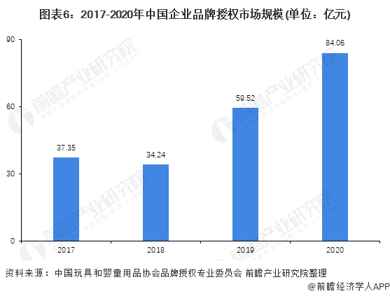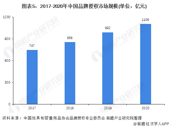 根据《2021中国品牌授权行业发展白皮书》,2017-2020年中国品牌授权市场规模逐年增长,2020年超过1000亿元,达到1106亿元,同比上升11.5%。