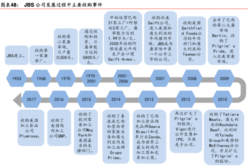 2012年5月,JBS收购了法国禽类加工场,开始对禽类加工部分的弱项进行有针对性的补强。2013年6月,JBS以27亿美元收购本土的Marfrig屠宰场。通过收购巴西加工食品领先企业seara brasil和皮革行业的zenda,成为世界上最大的鸡肉加工商和皮革加工商,每天能够处理80000张生皮,且36%出口到了中国。