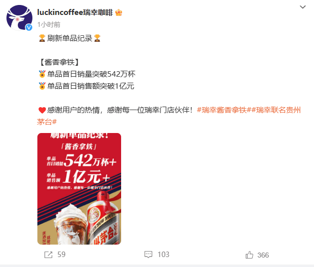 原标题:瑞幸酱香拿铁首日销量542万杯,首日销售额破1亿