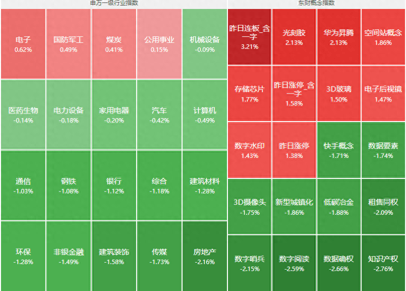 分行业来看,仅有电子、国防军工、煤炭、公用事业四大行业上涨,房地产、传媒、建筑装饰、非银金融、环保等板块领跌。